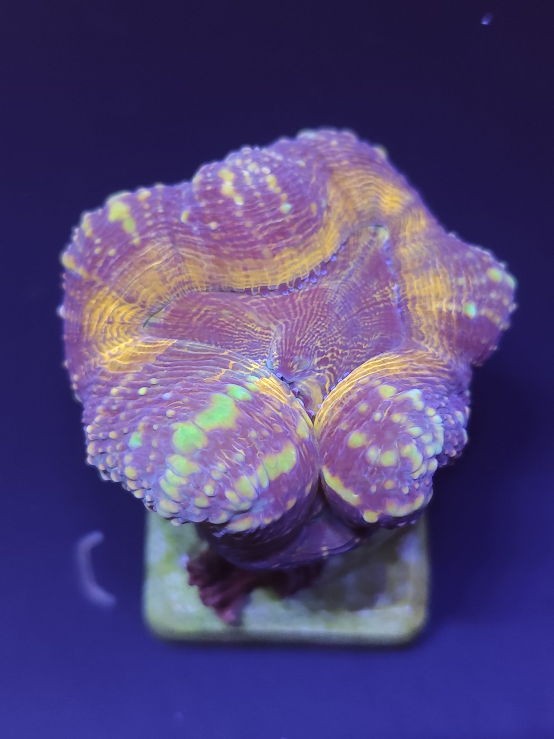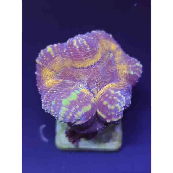 O Coral Trumpet Lobophilia é um coral LPS de formato robusto e cores vibrantes, com tons que variam entre vermelho, rosa e verde. Sua aparência volumosa e brilho intenso destacam-se sob iluminação azul, tornando-o uma escolha ideal para quem deseja um aquário marinho cheio de vida, cor e movimento natural.